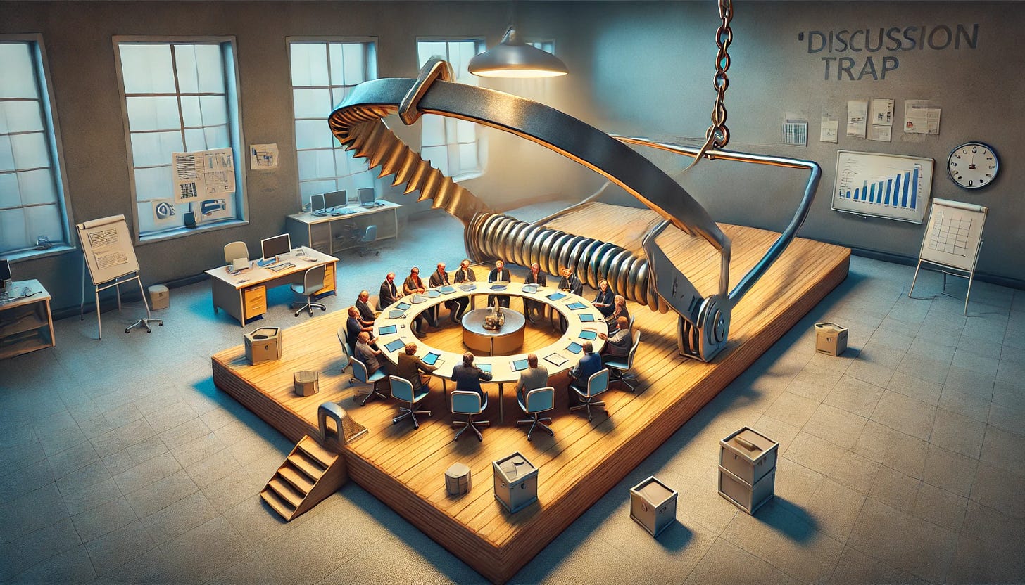 Leaders and teams often find themselves ensnared in the discussion trap due to a combination of structural and cultural factors. Here are some of the key reasons this happens: